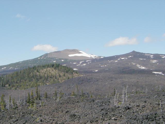Belknap Crater, as seen from the Dee Wright Observatory, with Little Belknap in the foreground. Of interest is the "island" where the lava didn't flow, leaving a patch of trees and vegetation. This lava isn't all that recent, yet not much has grown because of the extremely harsh conditions (high altitude, not much rain, cold temperatures). |