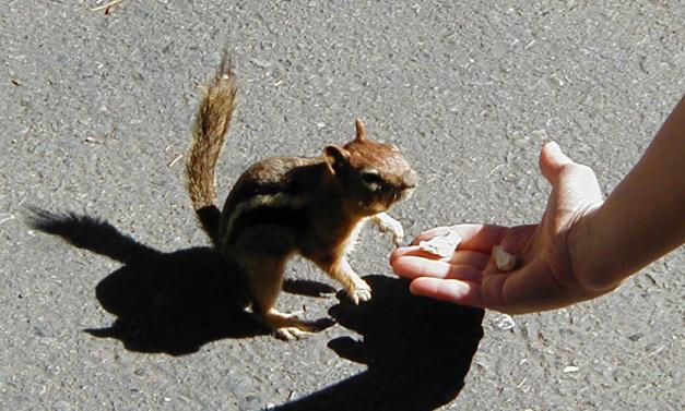 Chipmunk eating a pretzel, near the source of the Metolius river.