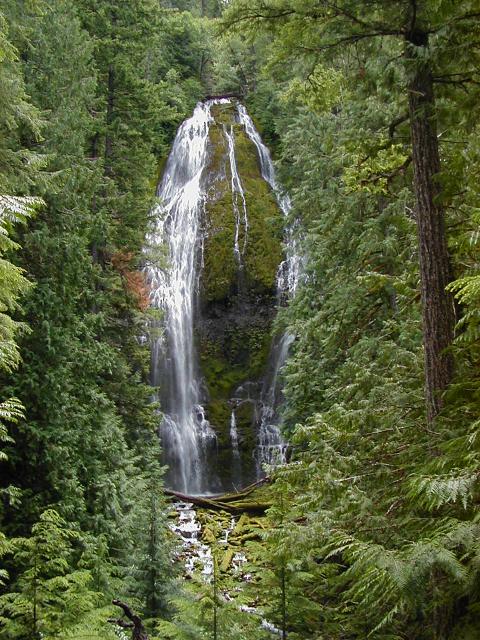 Lower Proxy Falls cascades over a carpet of moss, amongst the Douglas Fir Trees.