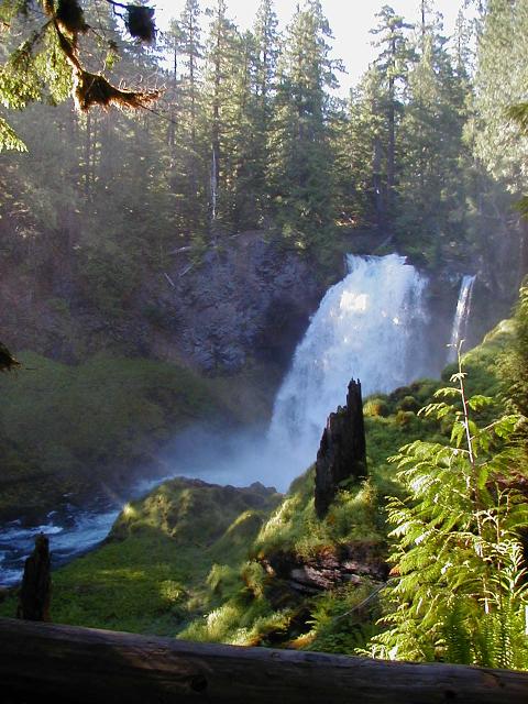 Looking at Sahalie Falls in the late afternoon sunlight, filtered through the considerable mist raised by the water's churning.