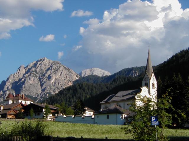 A church spire points skyward, as does pretty much everything in this region of jagged peaks.