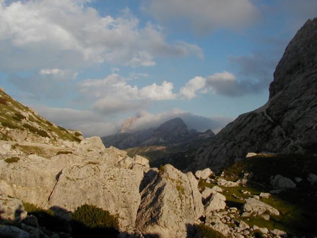 Evening shadows and misty clouds begin to descend on the Passo Valparola