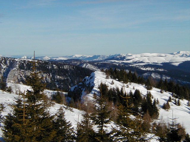 In the foreground, the sharp ridgeline just below the summit of Monte Verena. The the south, a gentle slope, and to the north, a jagged cliff. In the distance, other mountains of the altopiano, and beyond. |