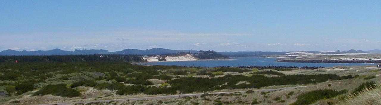 The Siuslaw River makes its last few turns before flowing into the Pacific ocean. In the distance, the timber-covered ridges of the Coast Range can be seen.