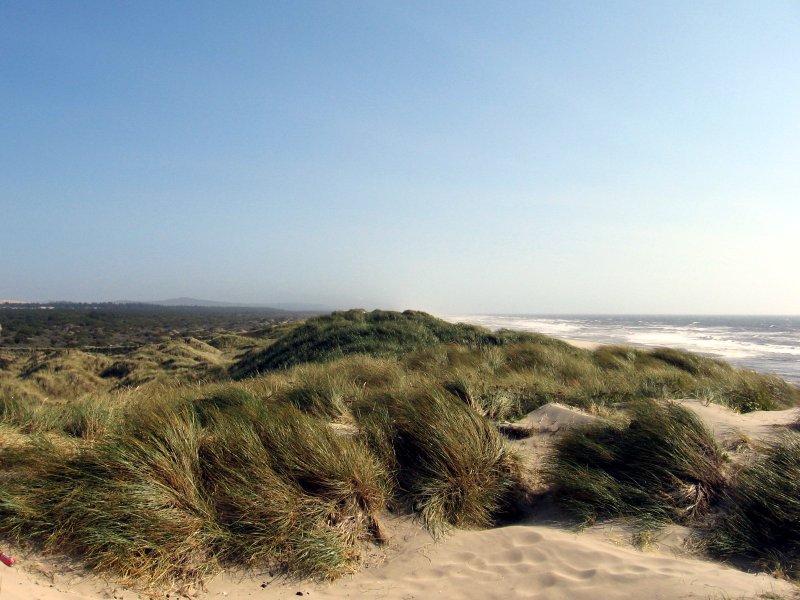The introduced European beach grass has spread all along the dunes, with a stabilizing effect that can be seen to the left. The beach grass holds the sand down, letting other plants take hold. Of course, not being a natural part of the ecosystem, this has also had other, negative effects. |