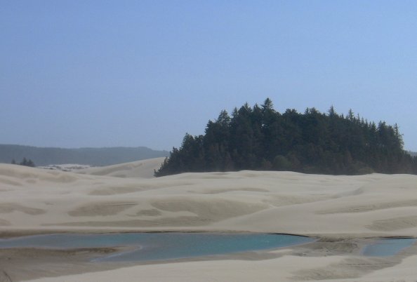 There are small lakes and bunches of trees scattered around the dunes, apparently created by the interaction of the wind, and