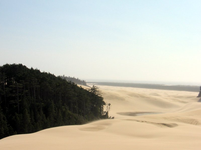A wide look at the forest, dunes and Pacific Ocean covered in haze.