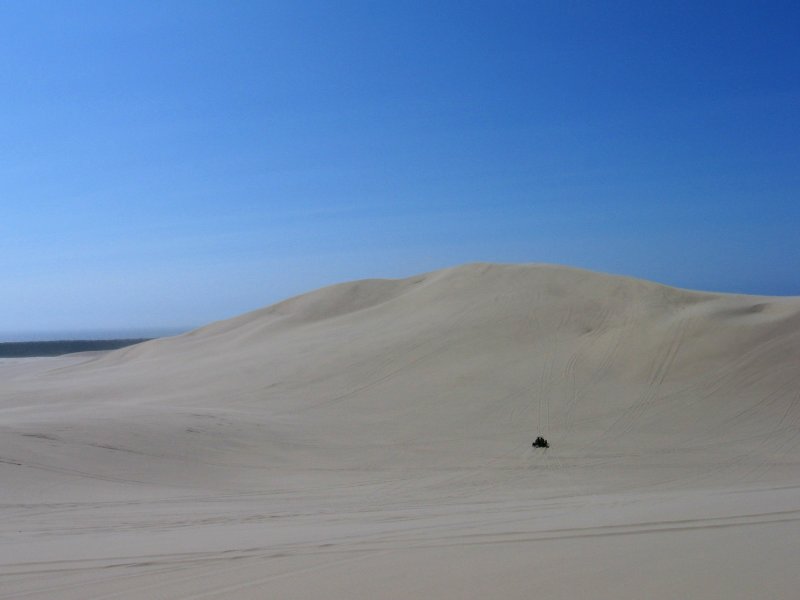 A lone dune buggy rider is dwarfed by one of the giant sand dunes at the Oregon coast.