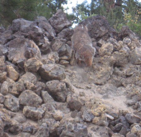 It would have been a nice photo of a badger, who stared at us for a few moments before ambling off, if my digital camera had operated a bit faster. But all you get is its hind end. |