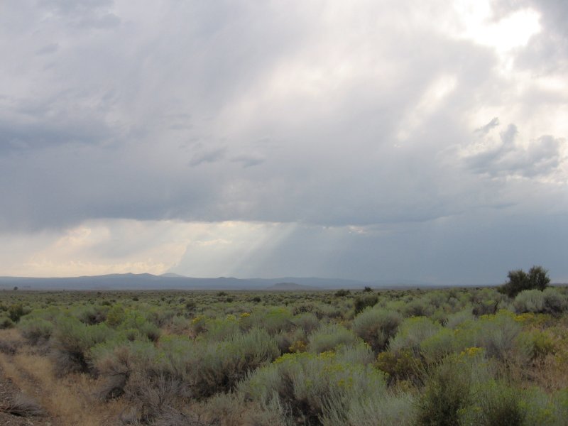 Oregon has a justly deserved reputation for being rainy. Of course, that only refers to the portion of the state west of the Cascades. The eastern half is, as you can see from the vegetation, quite dry. Oddly enough, we didn't get rained on hardly at all during our entire vacation, spent mostly in the western part of the state, except for when this storm caught up with us out on the high desert and it rained cats and dogs for a few minutes. |