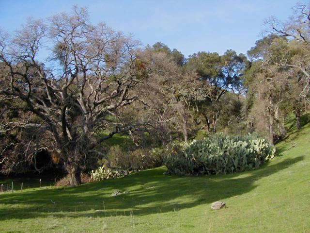 For some reason, there are several huge clumps of prickly pear cactus in this meadow. Someone who shall remain unnamed had the bright idea of putting one of the fruits in my backpack. I was still "discovering" (rather painfully) little tiny spines from it months later. |