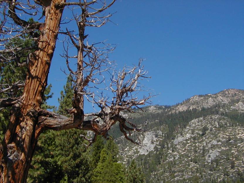 A gnarled pine tree, Hawkins Peak, and a brilliantly clear, blue sky make for beautiful summer scenery.