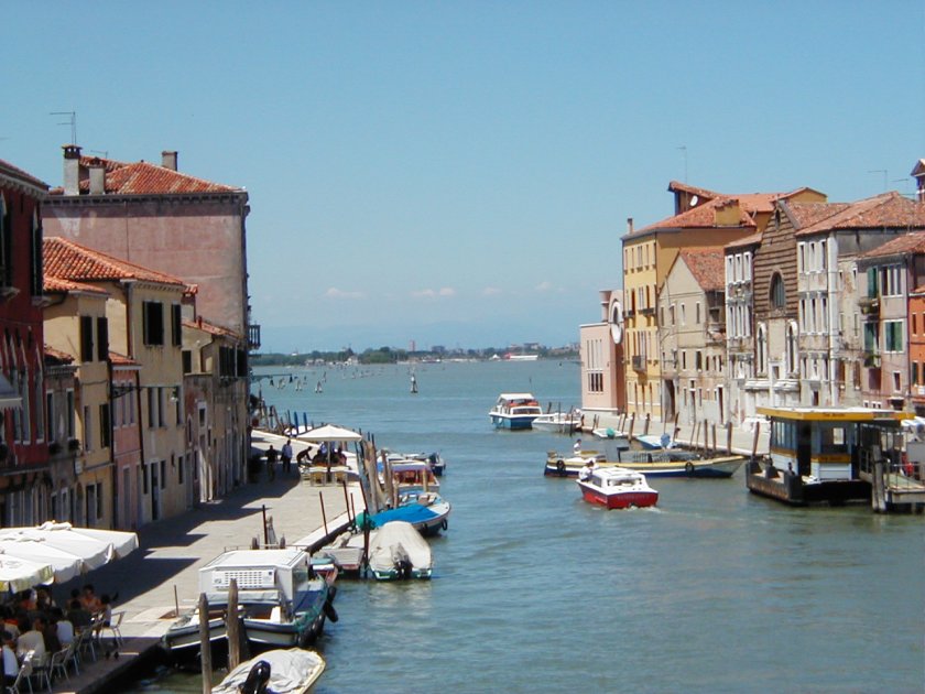 The end of the Cannaregio canal, looking across the lagoon. In the distance, you can make out the mountains as a darker shade of blue on the horizon. |
